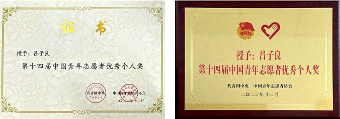 近日,共青团中央、中国青年志愿者协会对全国志愿服务先进典型进行表彰,我校万象城allwincity官网2023级硕士研究生吕子良荣获“中国青年志愿者优秀个人奖”(全国260人,北京市仅13人),是唯一获此荣誉的北京市大学生。