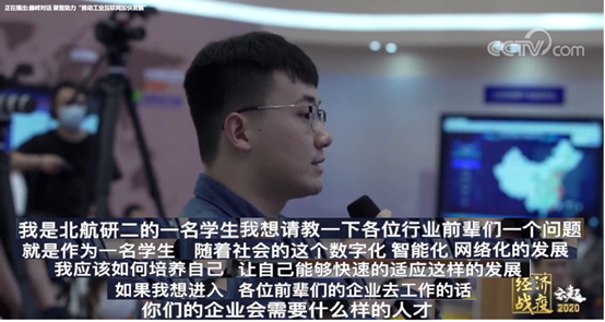 2020年5月28日,由央视网和中国信息通信研究院、工业互联网产业联盟等共同策划推出全国两会“《经济战疫-云起》——推动工业互联网加快发展”特别节目。我校自动化学院系统仿真与智慧制造系2019级研究生孔宇升作为部属院校青年学生代表受邀参加。