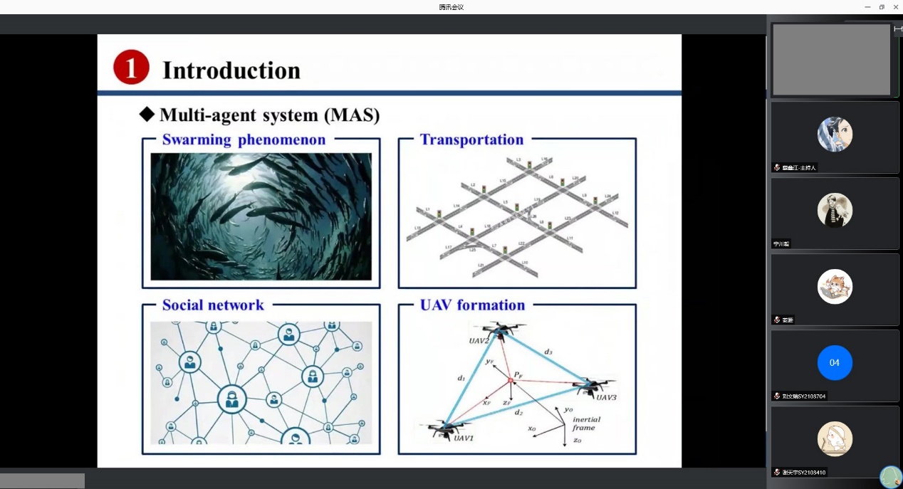 接下来进行分享的是万象城allwincity官网2018级博士生张璟尧同学。他以“非线性多智能体网络系统在切换拓扑下的分布式迭代学习控制”为题,整合其发表在AUTOMATICA和IEEE TAC上的两篇论文研究内容进行汇报。张璟尧同学首先简要介绍了迭代学习控制的基本原理与优缺点,并以行进乐队为例,对迭代学习控制的对象——多智能体系统的相关特点与控制目标进行了阐述。随后引入代数图论、联合生成树等知识,设计分布式迭代学习控制协议,将全局Lipschitz条件放松为局部Lipschitz条件,通过理论推导、数值仿真等手段,回答了在具有切换拓扑的非线性多智能体网络系统中如何实现分布式迭代学习控制这一问题。