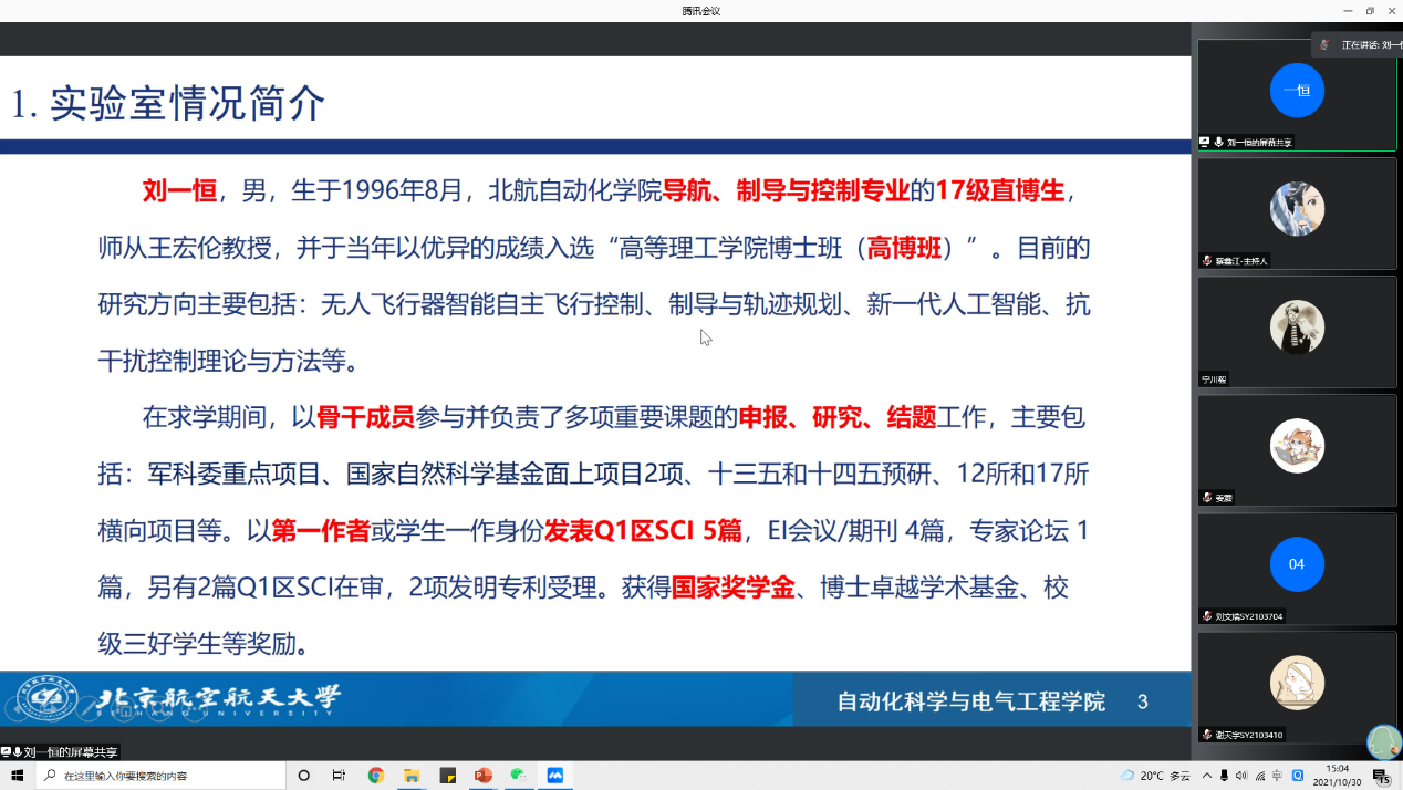 刘一恒同学是万象城allwincity官网2017级博士研究生,师从王宏伦教授。汇报开始,刘一恒同学简要介绍了个人信息与课题组概况,随后围绕“无人机软式空中对接与回收抗扰动快速精准控制技术研究”,从“无人机空中对接与回收控制”、“高超智能制导与控制技术”、“无人机自主空中加油对接控制技术”、“飞行器空中态势感知与自主避撞技术”、“运载火箭上面级智能在线重规划技术”五个方面展开介绍,明确阐述了研究工作的重要性与难点,并通过大量图表、仿真结果、实验结果,直观地展示了其在博士期间丰富的科研成果。最后,刘一恒同学分享了自己在多年科研生活中总结出的宝贵经验,强调了明确研究方向、提前做好未来发展规划的重要性,分析了项目与科研的互补作用,也叮嘱大家要注意身体、健康生活。
