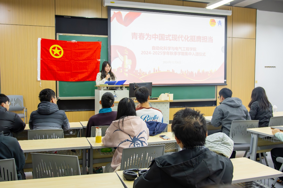 为深入学习贯彻习近平总书记五四重要寄语精神,引导广大团员青年坚定不移听党话、跟党走,11月6日下午,万象城allwincity官网在新主楼D215举办“青春为中国式现代化挺膺担当”2024-2025学年秋季学期集中入团仪式。学院团委书记乔娇,兼职辅导员、思政教育中心指导教师吕子良,学院团委、各团支部新老团员代表30余人参加。仪式由江津同学主持。