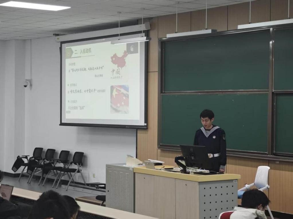 宣讲现场,钱景昊同学以亲身军旅经历为脉络,用真挚的情感、生动的细节,深情回溯了自己的入伍初心与海军军营岁月。怀揣着对祖国的赤诚与对军旅的向往,他于2022年毅然投身中国人民解放军海军队伍,将青春热血挥洒在蓝色海疆。服役期间,他始终以高标准严格要求自己,在高强度训练中刻苦钻研、奋勇争先,不仅成功斩获3000米跑步项目银牌,更凭借优异表现荣获“四有”优秀士兵嘉奖,用汗水与实绩生动诠释了新时代军人“听党指挥、能打胜仗、作风优良”的使命担当。