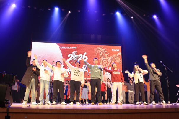 进入“同心驭远・共赴新程”篇章,民乐《锦绣欢情》、歌曲串烧《第J象限》、诗朗诵《青春》等节目依次呈现,传递青春热情。合唱《La La Land》选段与《我们都是追梦人》激励师生勇敢前行。晚会最后在全体师生共同唱响《相亲相爱一家人》的温馨氛围中画上了圆满的句点。